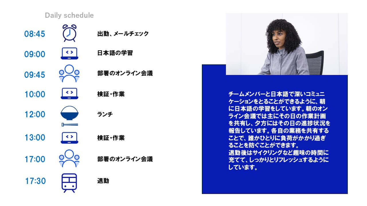 私はサイクリングが大好きで、その他にもパズルやウォーキングなどたくさんの趣味があります。入社前には、趣味など自分の時間を確保できるか心配していた面もありますが、現在は遅くとも午後6時前には仕事を終えてプライベートを楽しんでいます。もちろん、突発的なトラブル対応が求められる時や繁忙期は負荷が高まることも事実ですが、メリハリをつけてワークライフバランスを保つことができています。