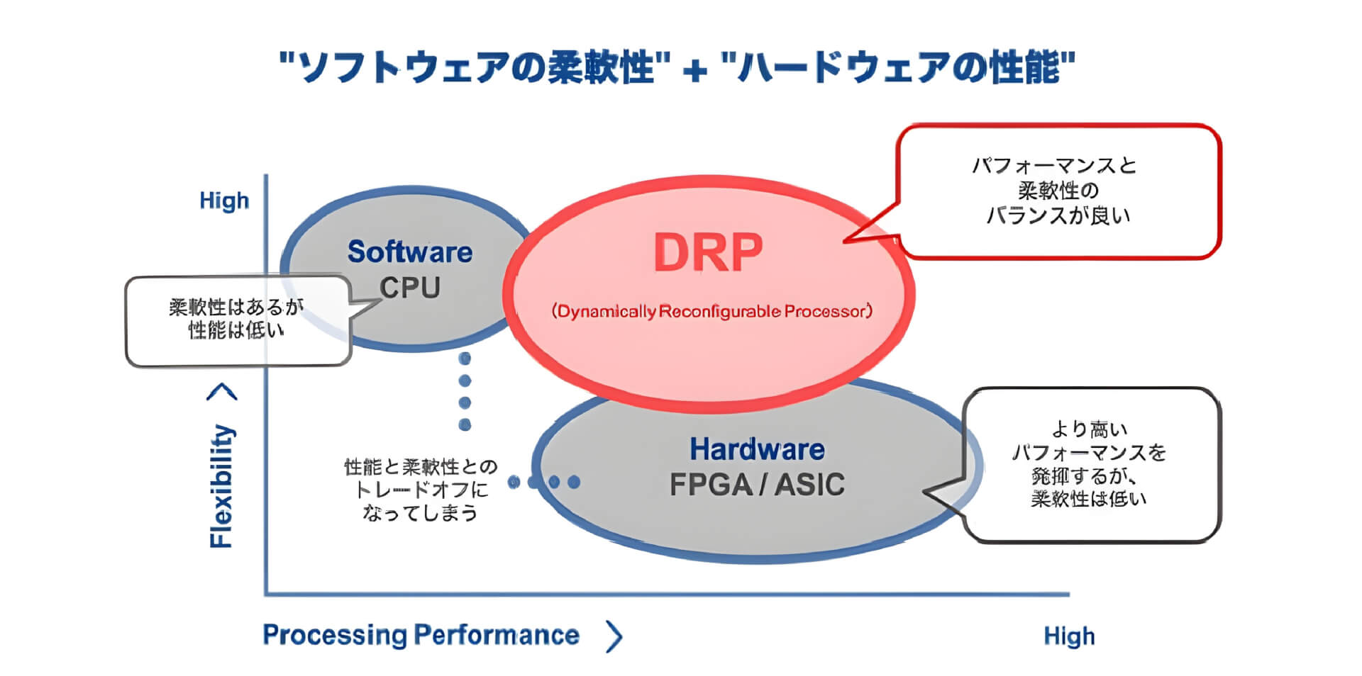 DRP (Dynamically Reconfigurable Processor) とは、ソフトウェアの柔軟さとハードウェアの高速性を兼ね備えたプログラマブルハードウェアのことです。「DRP-AI」を内蔵したMPU「RZ/V2M」では、組込み機器で課題となる低消費電力化を実現し、放熱対策が容易となります。これにより、機器の小型化が可能となりました。