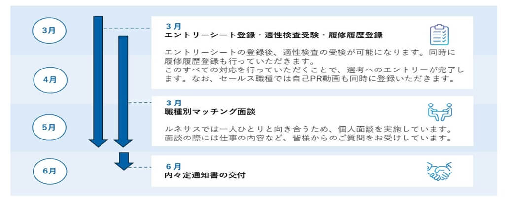 ルネサスでは「職種別採用」を実施しています。応募の際にはチャレンジしたい「職種」を選択いただき、職種別に選考を行います。職種選択の際には専攻を問いません。