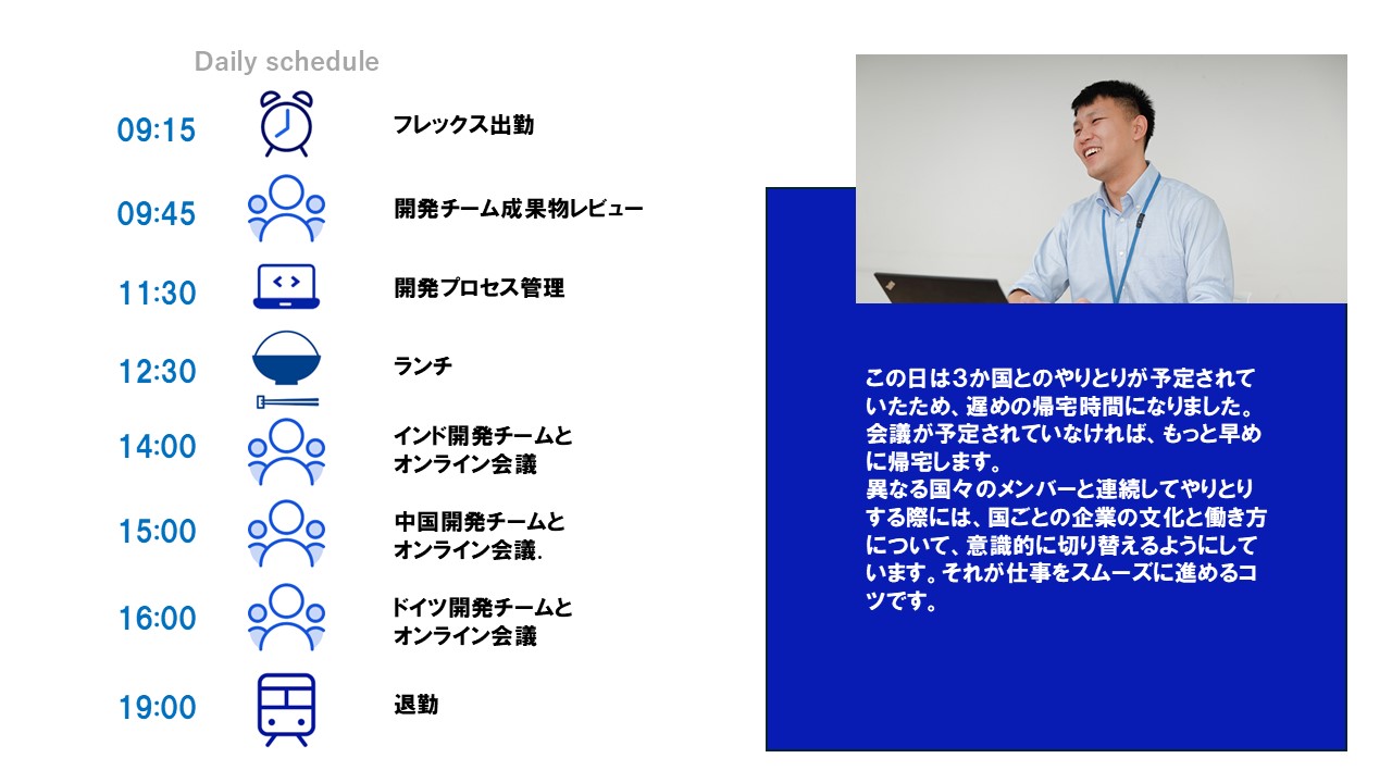世界各国の方たちとコミュニケーションを取るときに大切なのは、お互いの国の文化を尊重するということです。特に意識しなくてはいけないのは、仕事に対する意識についてです。私自身は日本で働いている中国人であるため日本流の働き方には慣れていますが、ヨーロッパなどではバカンスで1カ月近くの長い休暇を取る習慣のある国があります。そのため、仕事のスケジュールを立てるときにはそのことを頭に入れておかないと、進捗に影響が生じてしまいます。