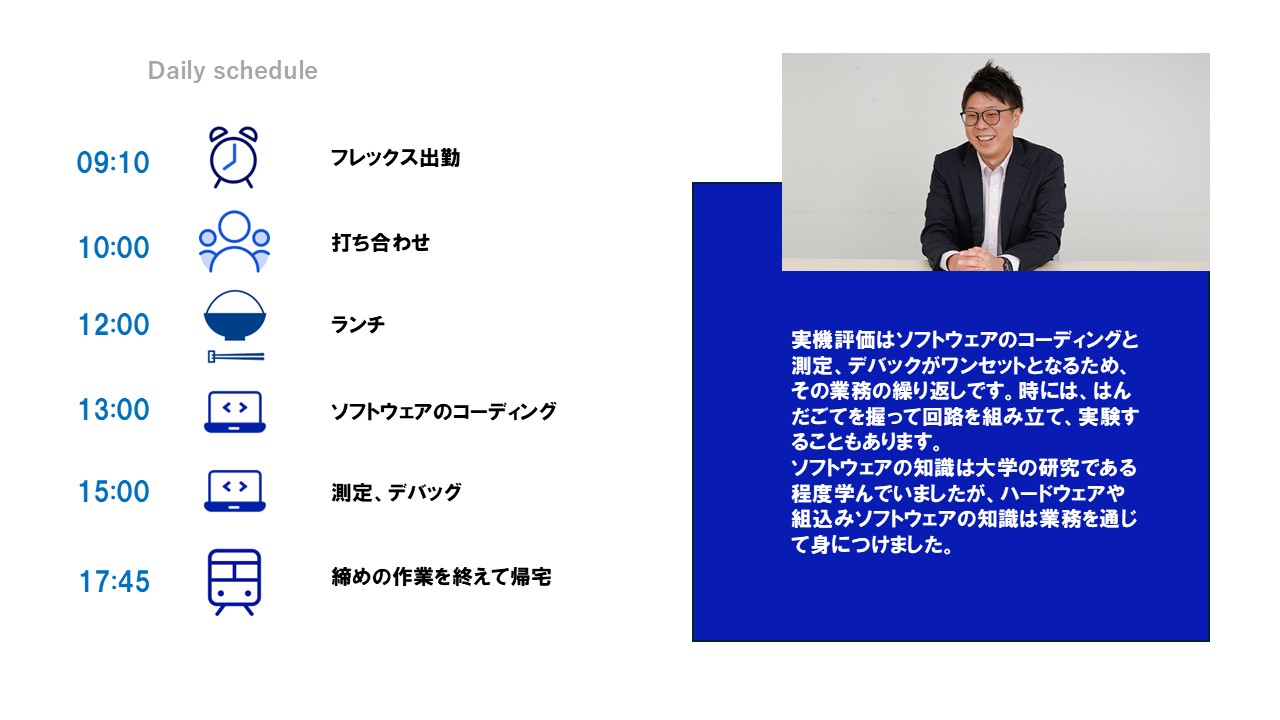 長野県の大学に在学していたため車を運転する機会が多く、就職活動時は自動車メーカーを中心に検討した。そうした中、ルネサス エレクトロニクスの説明会で自動運転の技術に興味を持ち、入社を希望。現在は、自動運転を実現する車載向けSoCの実機評価を担当。プライベートでは、ルネサスのサッカー部のキャプテンを務めている。