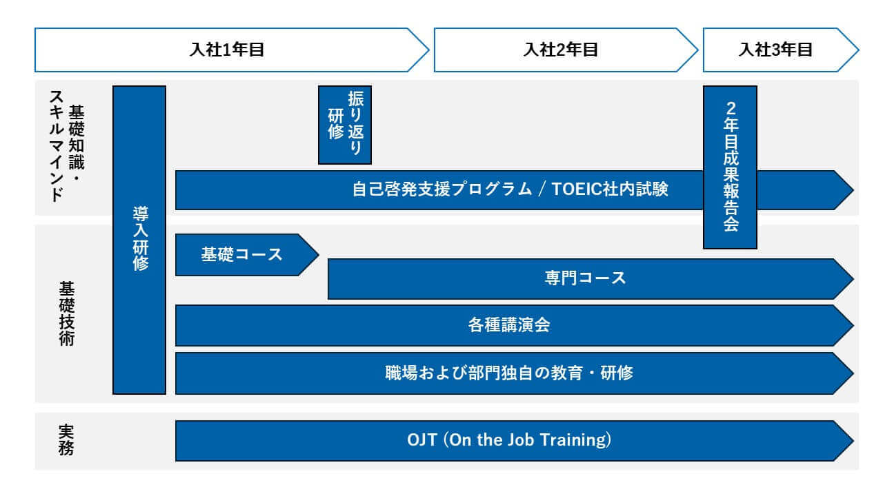 当社では、グローバル競争力のさらなる強化を目的として、豊富な研修プログラムで社員の職務能力向上を支援しています。 とりわけ、新入社員の育成に関しては、一人ひとりに専任の育成担当者を配置し、基礎技術やスキル、マインドなどグローバルに活躍できる能力開発支援に力を入れています。